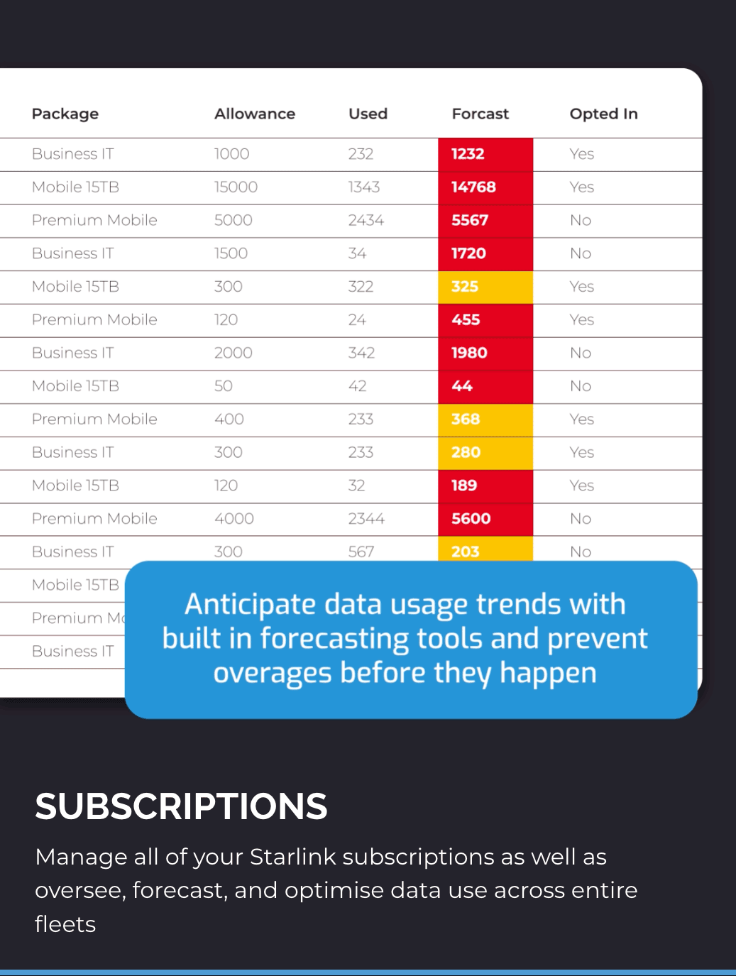 Manage all of your Starlink subscriptions as well as oversee, forecast, and optimise data use across entire fleets